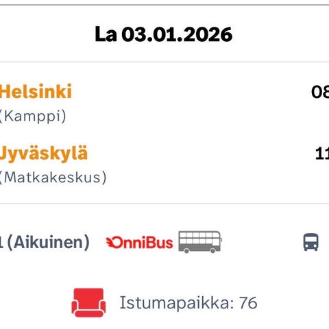 OnniBus lippu Jyväskylä matkakeskus - Kamppi la 3.1. klo 14:15 - 17:45. Ikkunapaikka. Lipun toimitus sähköisesti.