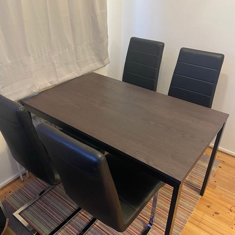 Myydään jatkettava ruokapöytä, jalat valkoiseksi maalattu puu, kansi tummenruskeaksi petsattu. Pöydässä näkyy käytön jälkiä (ks. kuvat) mutta on muuten tukeva ja hyväkuntoinen.