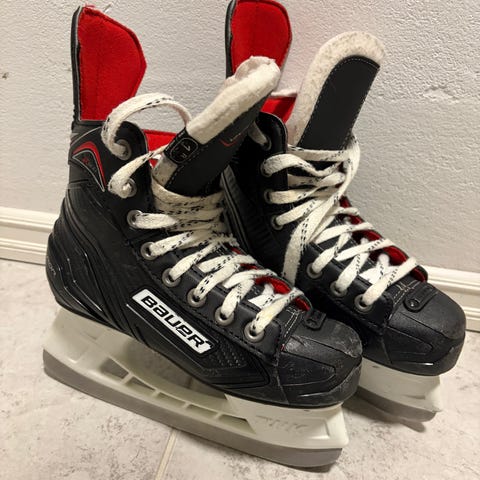Bauer Jääkiekko luistimet lasten koko 33. Luistimet ovat mustat ja punaisilla nauhoilla. Sopivat jääkiekon harrastamiseen.