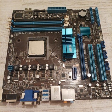 Täysin toimiva Asus -emolevy M5A78L. Emolevy on ATX -kokoinen ja siinä on AM3+ kanta, joka tukee monia AMD -suorittimia.