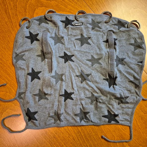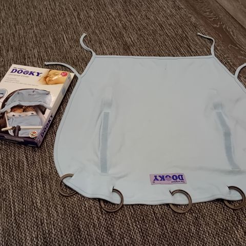 Dookyn UPF 40 vaunuverho ihanan pehmeää puuvillaa. Valkoisessa kankaassa harmaa lenninhaivenkuvio. Viisi rinkulaa. Sivuissa narut, joilla verhoa saa säädettyä tarpeen mukaan, ja keskellä tarranauhat rullaamiseen. Tarrat pitävät hyvin. Tämä verho on kätevä, sillä se käy lapsen kasvaessa kaikille eri kuljetusvälineille: turvakaukalo, vaunut, rattaat..