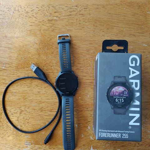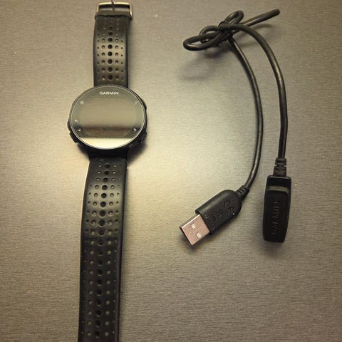 Garmin Forerunner 235 urheilukello mustalla rannekkeella. Kellossa on digitaalinen näyttö ja se sopii aktiiviseen käyttöön. Mukana USB-latauskaapeli. Kello mittaa aktiivisuutta ja sykettä, ja siinä on Bluetooth-yhteys.