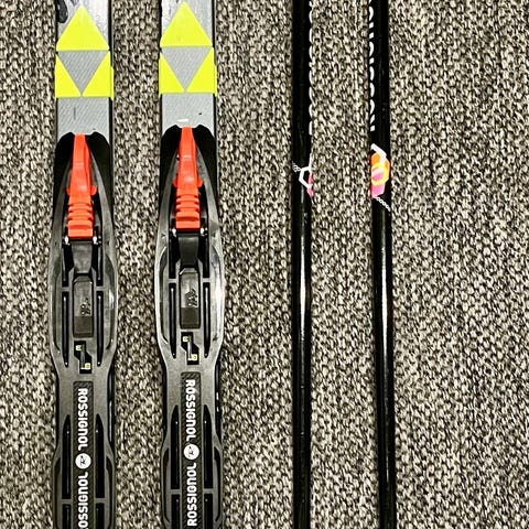 Fischer sukset NNN siteillä ja exel sauvat.Nämä on olleet käytössä kolmen lapsen koulu hiihdossa eli käytön jälkiä on, mutta ovat vielä ihan toimivat, jos tarvitset suksia vain esim.kouluhiihtoon.
