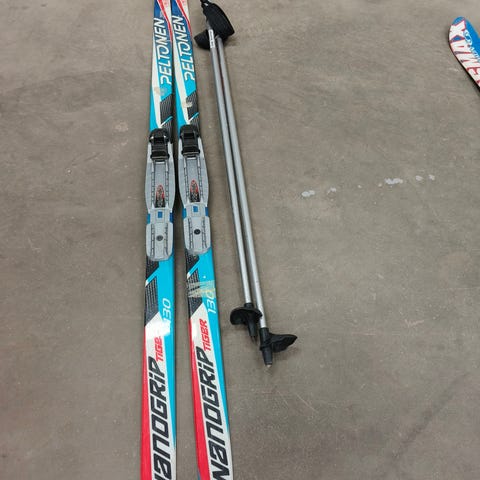 Myydään kuvan sukset&sauvat. Sukset 140cm. Viime talvena viimeksi hiihdetty, tarvinnee voitelua. Nouto Kouvola Käpylä.