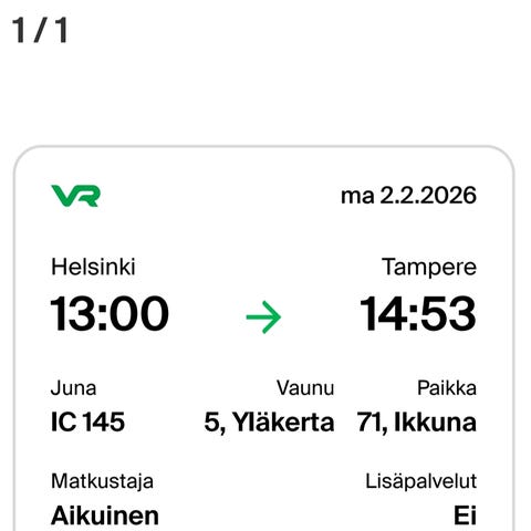 Myydään normaali aikuisten junalippu Tampereelta Helsinkiin pe 30.1. klo 16:04 - 17:59.