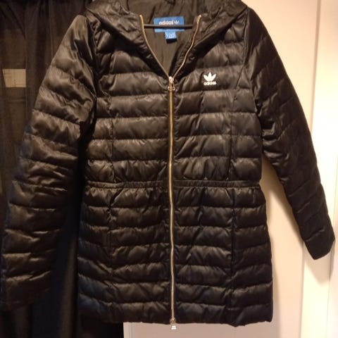 Adidas-takki musta, valmistettu polyesteristä, naisten koko 34.