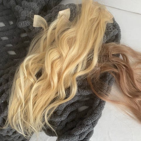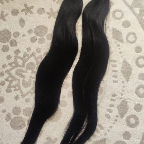 Teippipidennykset 50cm aitoa remy hiusta. Hiukset on leikattu hieman kerroksittain (perhosleikkaus) sekä vähän lyhyeemmiksi ja pidetty oikeassa järjestyksessä, jotta hiukset on helppo laittaa takaisin päähän niin että leikkaus pysyy. Käytetty viikon verran ja pesty 2 kertaa hiustenpidennys tuotteilla, hyvässä kunnossa siis. Oikea hinta 510€. Sisältää 3 pkt (yht. 15 paria)