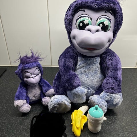"Tiki-gorillalla on suloinen pentu Toko, jota se keinuttaa sylissään. Interaktiivisilla gorilloilla on yli 100 erilaista toimintoa! Leluilla voi leikkiä myös erikseen ja niillä on yhteisiä ja omia ääniä ja reaktioita. Paristot 4xC, 3xAAA"
