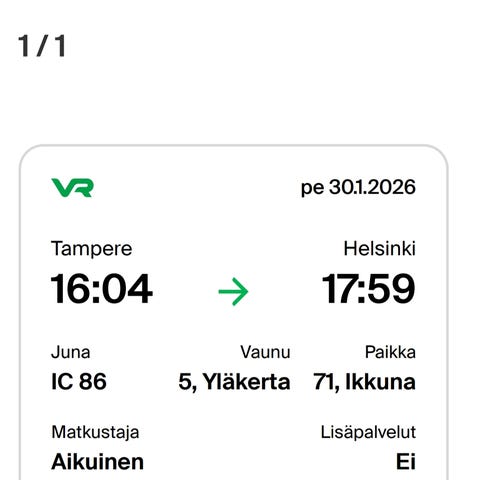 Myydään aikuisten normaali junalippu Helsingistä Tampereelle ma 2.2. klo 13:00 - 14:53.