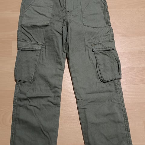 Poikien reisitaskuhousut, Kappahl 128cm, kevyttä, mutta kestävää kangasta. Väri on vihreä khaki. Tosi tyylikkäät. Kuminauha+nappisysteemi vyötäröllä.