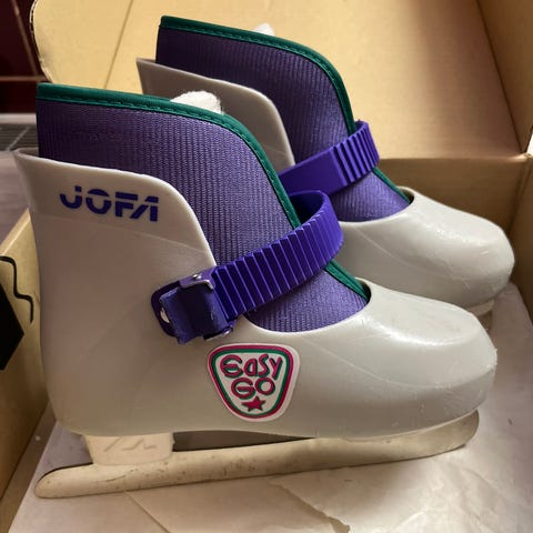 Jofa lasten luistinkypärä ja valkoiset Mia-luistimet koko 30.