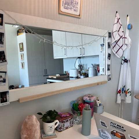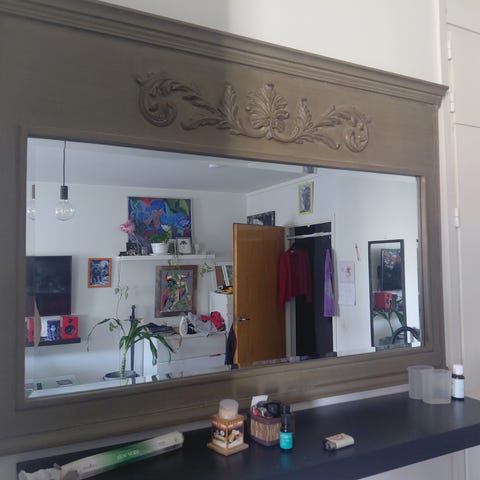 Seinäspeili, jossa on koristeellinen kehysvalmistus. Kehyksen väri on vaalea. Peili sopii sisustukseen, jossa korostetaan klassista tai vintage-tyyliä.