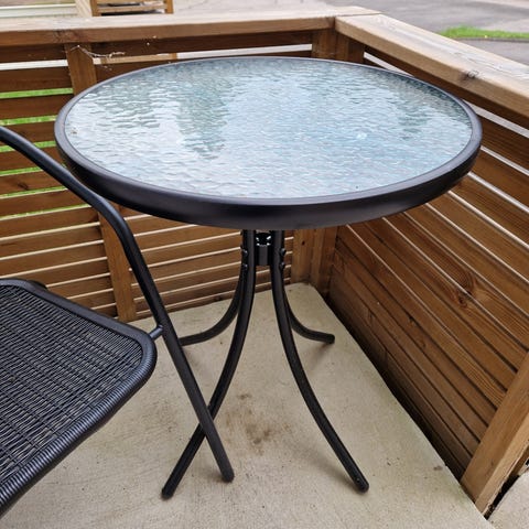 Pyöreä lasipöytä mustalla metallirungolla ja musta metallinen jakkara, jossa rei'itetty istuin. Pöytä ja jakkara soveltuvat sisäkäyttöön.