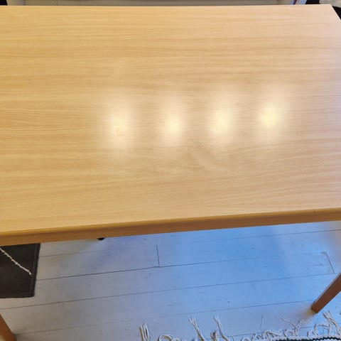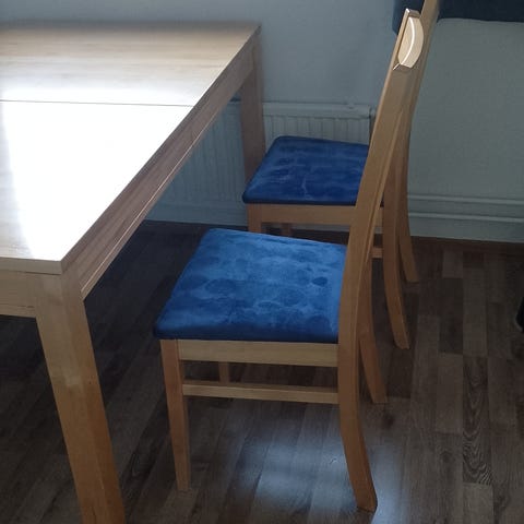Myynnissä seuraavaan kotiin suoraan käytöstä poistuva ruokapöytä+ 6 tuolia. Tuolien istuinkorkeus 45 cm. Pöytälevyssä muutamia jälkiä, jotka pyritty huomioimaan hinnassa. Muuten pöytä palvelee hyvin tarkoitustaan.