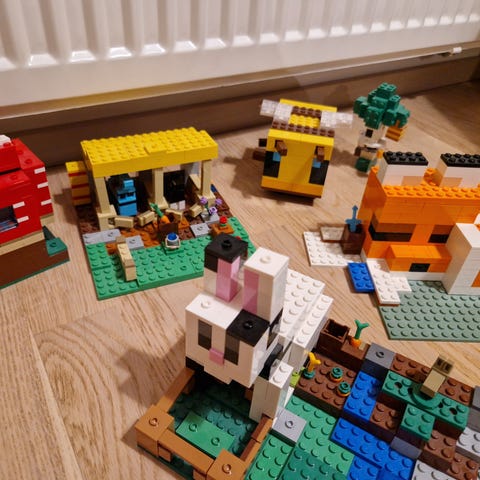 Myydään Minecraft legoja (4 eri legoa, uutena setin hinta reilu 100e). Myydään settinä. Joitakin paloja puuttuu, sienitalosta esim. puu ja hämähäkki. Suurin osa kuitenkin tallessa ja kuvassa setit koottuna. Mukana yhteensä 9 eri hahmoa ja neljä eläintä + miekkoja. Talojen sisällä kaikenlaisia yksityiskohtia. Hyvä setti leikkeihin! Ohjeet tallessa. Hinta yhteensä 50e. MMM.