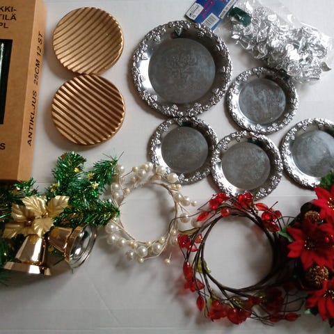 Kaikenlaista joulutavaraa ja valosarjoja.