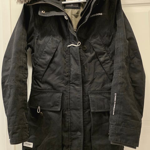 Myyntiin Didriksons talvitakki / parkatakki, koko 36. Reiluhko koko, sanoisin menevän myös koko 38 käyttävälle. Takana kiristys mahdollisuus resorilla. 100 % waterproof, edessä kaksi vetoketjutaskua sekä kaksi napillista taskua, yksityiskohdat heijastavat, kiinteä huppu, karvan saa hupusta irti, hihoissa resorit, peukaloille kolot sekä kiristys tarralla. Väri musta. Takkia ei ole pesty, joten ominaisuudet tallella. Ollut vähäisellä käytöllä. Hp. 70€