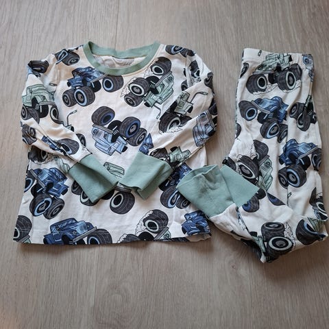 Myydään KappAhlin monsteriautokuvioinen yöpuku / pyjama, sis. paita ja housut, 86/92 cm. Siisti ja hyväkuntoinen, ollut yhdellä lapsella käytössä.