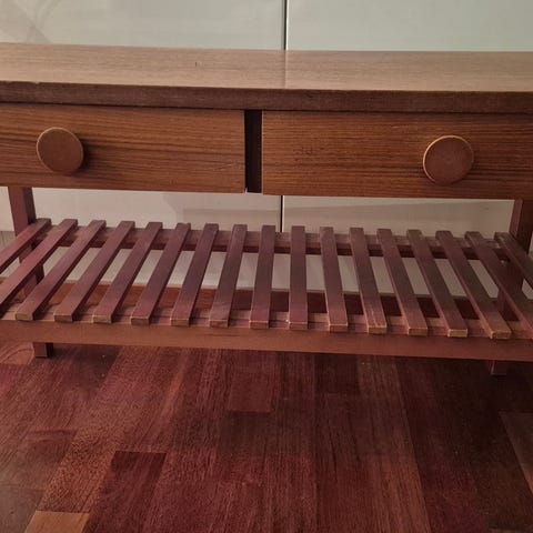 Tämä vintage puhelinpenkki on valmistettu puusta ja siinä on kaunis kukkakuvioinen istuinpehmuste. Penkissä on myös pieni kaappi, joka tarjoaa säilytystilaa pienille esineille. Sen muotoilu on yksinkertainen mutta käytännöllinen, ja se sopii hyvin monenlaisiin sisustustyyleihin.Tämä puhelinpenkki edustaa 60-luvun retrotyyliä, joka oli suosittu aikakaudellaan. Tällaiset huonekalut olivat yleisiä kodeissa, joissa tarvittiin paikka puhelimelle ja istumiseen. Penkin puumateriaali ja kukkakuvioinen pehmuste tuovat esiin aikakauden tyypilliset piirteet.Penkissä on näkyvissä kulumisen merkkejä, kuten naarmuja ja pieniä kolhuja puupinnassa. Istuinpehmuste on hieman haalistunut, mutta muuten ehjä. Kaapin ovi toimii moitteettomasti, mutta siinä on pieniä käytön jälkiä.