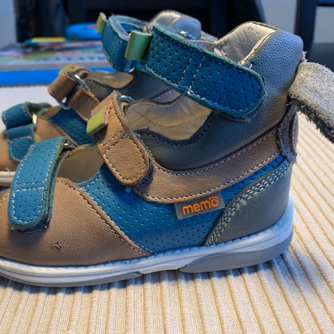 Memo lasten tukevat sandaalit, koko 23, unisex. Sandaalit ovat moniväriset, pääosin vihreän, oranssin ja harmaan sävyisiä. Ne on varustettu kolmella tukevalla tarrakiinnityksellä ja pehmeällä nahkaisella sisävuorella. Sandaalit tukee jalan ja nilkan asentoa sekä lisää tasapainoa. Luistamaton pohjamateriaali. Kokonaan nahkaa.
