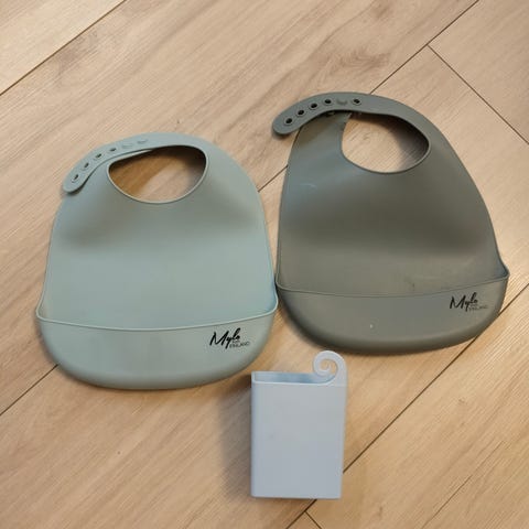 Mam pienempiä vanhoja tuttipulloja, olleet kaapissa usiamman vuoden nii en tiedä onko vielä käyttökelposia. Pussissa mukana myös silikonialustallinen ruokalautanen ja hihallinen ruokalappu.
