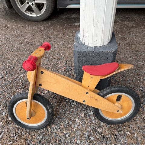 Vihreä potkupyörä, umpikumirenkaat joten varsin huoltovapaa.