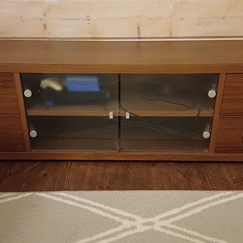 Lipastossa on kaksi vetolaatikkoa, mitkä toimivat hyvin. Muutamia pieniä kolhuja ja naarmuja on tullut lipaston pintaan ajan myötä (niistä kuvat)