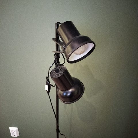 Toimiva lattiavalaisin, jäänyt tarpeettomaksi. Valaisin on ehjä, mukana tulee kirkkaan värinen lamppu.