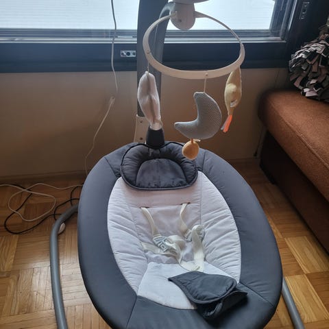 Myydään Beemoo rocker sitteri. Ostettu käytettynä, siistissä kunnossa ja äänet toimii. Pesty päältä tekstiilipesurilla mutta alapuolella kankaassa pinttymää