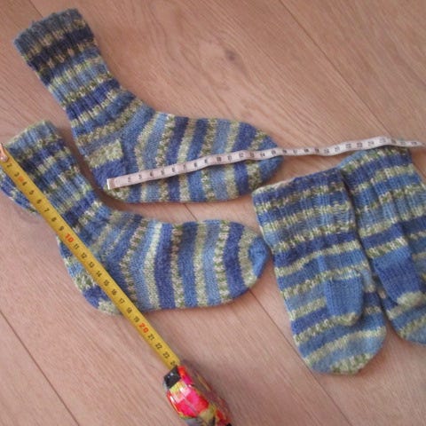 Ruskea/sini/valkoiset villatumput ja –sukat (myyn vain settinä). Unisex malliset.
