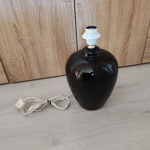 Korkea lampunjalka toimivalla valaisimella, jossa naru vetokytkimenä. Varjostin puuttuu. Lampunjalka on luultavasti tammea ja siinä on koristeellinen metallinen jalkaosa.
