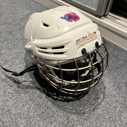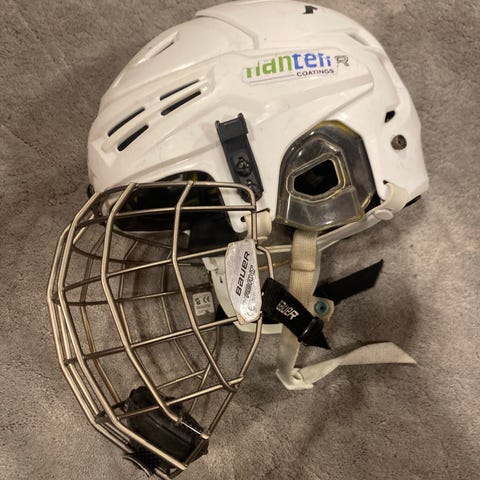 Bauer Jääkiekkokypärä ristikolla. Koko aikuisten S (päänympärys 52-57 cm). Ollut lapsella käytössä monta vuotta mutta vielä melko siistissä kunnossa ja käy ainakin ulkojäille.