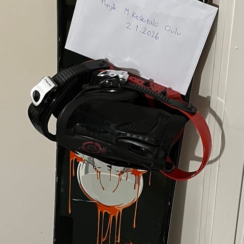 Mukana Nitron siteet (aikakauden perus/freeride–allmountain -siteet), jossa punaiset ja mustat siteet. Eli sisältää siteet, jotka on suunniteltu kiinnittämään lumilautailijan kengät lautaan turvallisesti. Kantit ehjät. takapuolella naarmu mutta ei ole haitannut menoa.