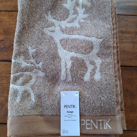 Tarjolla 2 uutta, ruskeaa Pentikin Saaga käsipyyhettä käyttämättömänä. Materiaali on 55 % pellavaa, 45 % puuvillaa.