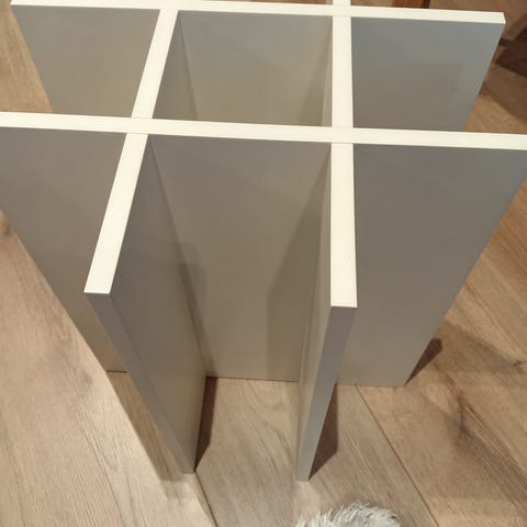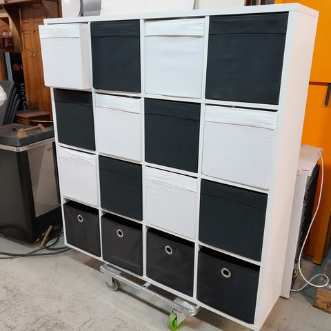 Musta Kallax hylly, neljä valkoista laatikkoa sekä kaksi sisäkaappia. Siisti kunto mutta jonkun verran käytön jälkiä