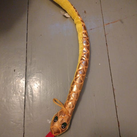 Lasten pehmolelu, pehmeä ja pitkä matelija, vihreä väri, soveltuu lasten leikkeihin.