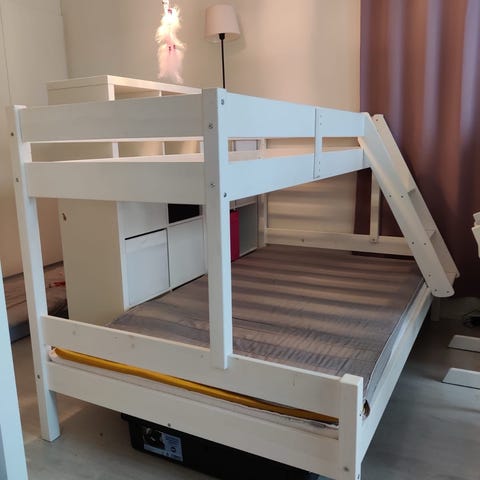 Hyvässä kunnossa kerrossänky, ala sänky 200 x 150 ja ylä sänky 200 x 90. Muutama naarmuja mutta tukeva ja painava. Patjat on myös hyvässä kunnossa.