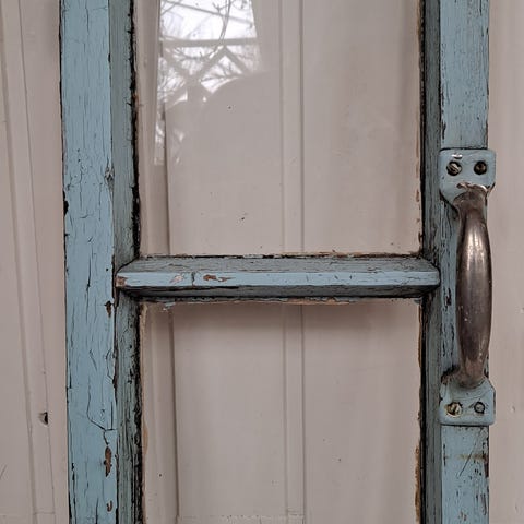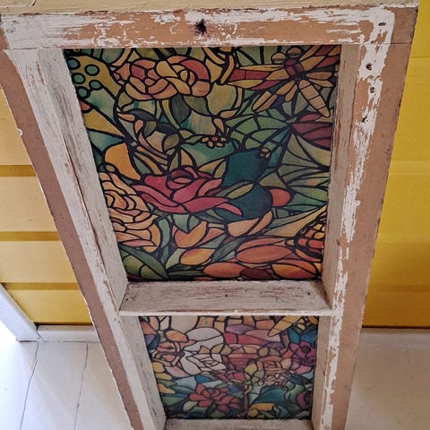 Vanhan mökin ulko-ovesta talteen otetut tummennettua ja koristeellista lasilistaa