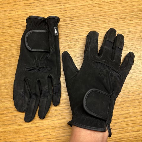 CRW ratsastushanskat, koko 8-11 vuotta, tummanharmaa väri. Hanskat on keinonahkaa, jossa on tarrakiinnitys ranteessa. Ehjät ja siistit mutta toisessa hanskassa pinnoite vähän sormien välissä kulunut, tästä kuva.