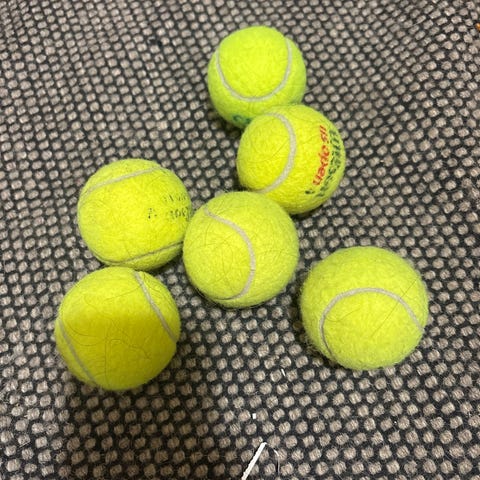 Käytetyt tennispallot, 6 kpl. Pallot ovat käytettyjä, ja tenniksen peluusta poistettu. Mutta erinomaisia askarteluun/koiralle/etc. Näitä 6 pallon settejä löytyy 5kpl. Sijaitsee Vallilassa.