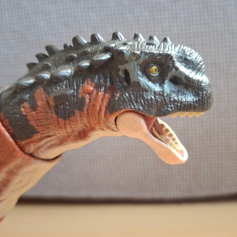 Mattelin valmistama Jurassic World vihreän ja oranssin sävyissä oleva dinosauruslelu albertosaurus. Lelun pituus noin 33cm. Kunto erinomainen. Jalan alla myös koodi jurassic world play-peliin. Dinon hännän nappia painamalla suu sulkeutuu. Pelkkää häntää kääntelemällä myös pää kääntyilee. Liikkuvat raajat. Tässä dinossa ei ole patteritoimintoa eikä ääntä. Tämä lelu vuodelta 2020.