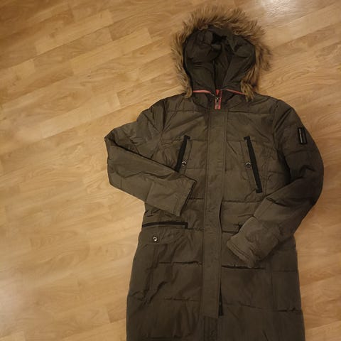 Puolipitkä talvitakki. Suhteellisen ohut, ei koville pakkasille. Tosi siisti. Edessä vetoketju ja nepparit. Sivutaskut vetoketjuilla.