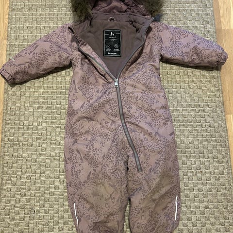 Siistikuntoinen Name it toppahaalari, jossa edessä tupla vetoketju ja ehjät kestävät jalkalenkit. Kuviointi tähtikuvio pinkki lila. Irroitettava huppu.