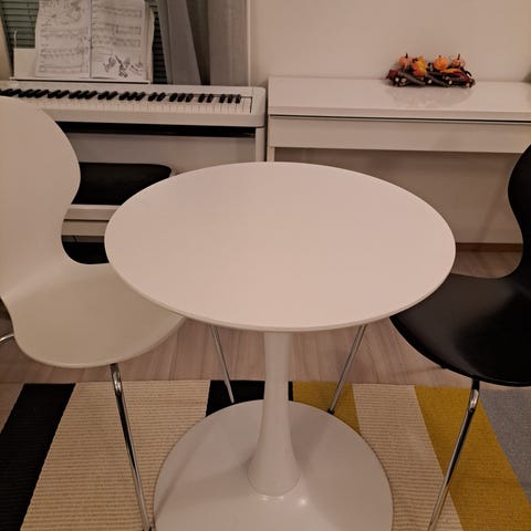Myynnissä myös lähes uudenveroinen valkoinen pyöreä pöytä ; Ikea Docksta pöytä (105 cm halkaisijaltaan)