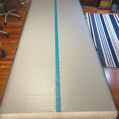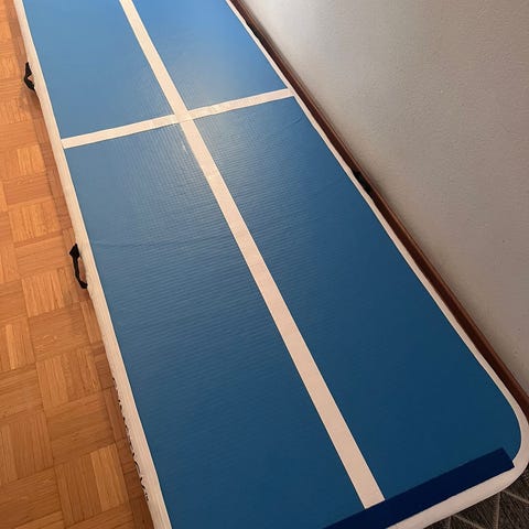 Abilica Air Track ilmatäytteinen jumppamatto, kokoa 300 x 100 cm, väri sininen ja valkoinen. Paksuus 10cm. Mukana täysin toimiva ja ehjä käsipumppu.