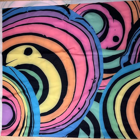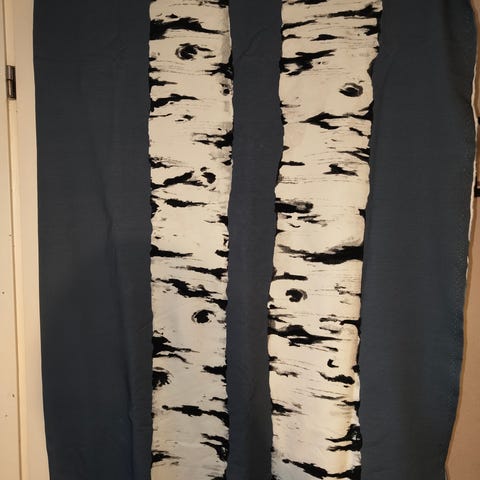 Ommellinen lumous kangas vaaleanharmaa pohjaväri, jossa suuria kukkakuvioita. Kukat roosan (?) sävyisiä ja lehdissä metsänvihreää/harmaanvihreää. Kangas on muistaakseni käyttöönottopesty. Pituus noin 170 cm ja kankaan käyttöleveys noin 155 cm. Palasta ei ole leikelty eli se on suorakaiteen muotoinen pala. Kangas on paksuhkoa trikoota. Eläintalous.