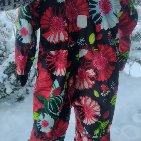 Hauska toiminnallinen lasketteluhaalari, väreinä tumma pinkki, valkoinen, neonpinkki ja ”neonaniliini”. Vesipilari ollut 20 000, pesty kaksi kertaa, joten vedenpitävyyttä hyvin tallella. Erinomaiset lumilukot hihoissa ja lahkeissa. Kätevät henkselit sisäpuolella. Ollut yhdellä tytöllä kahtena talvena.