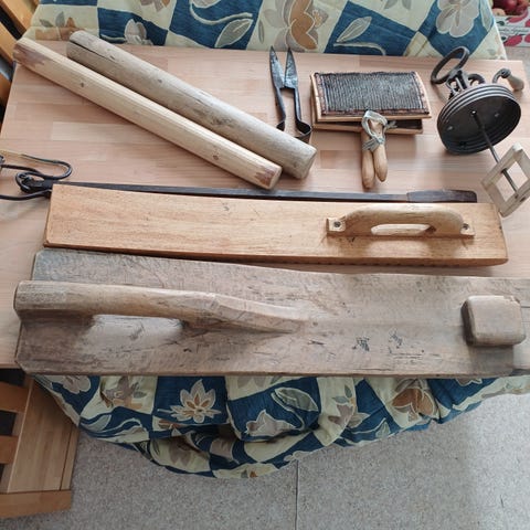 Pyykkärin paras kaveri, mankeli, toimii ilman sähköä. Noin 100 vuotta vanha. Lakanat kierretään pötkylän ympäri ja sitten laudalla veivataan pöydän pintaa pitkin. Talonpoikaisantiikkia.