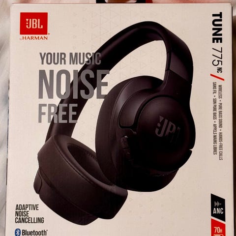 Paketissa JBL Tune 775BT langattomat kuulokkeet, joissa on aktiivinen melunvaimennus ja Bluetooth-yhteys. Kuulokkeet ovat mustat ja tarjoavat langattoman äänenlaadun sekä mukavan käyttökokemuksen.