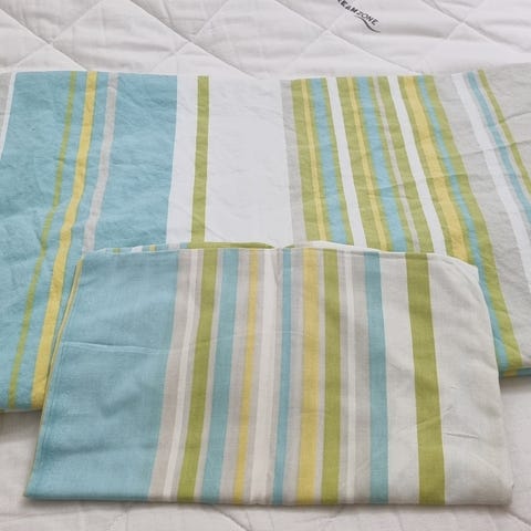 Hyväkuntoiset ja siistit, hajusteettomasti pestyt. Tyynyliina on kuluneempi kuin uudenveroinen pussilakana, tyynyliinan turkooseissa palloissa näkyy hieman haalistumaa ja valkoisessa taustassa on hiukan kellastumaa.